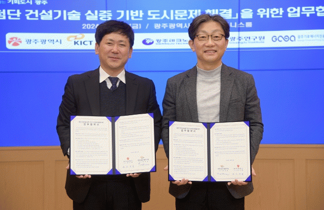 광주광역시는 13일 시청 비즈니스룸에서 한국건설기술연구원과 ‘첨단 건설기술 실증 기반 도시문제 해결을 위한 업무협약’을 체결했다.