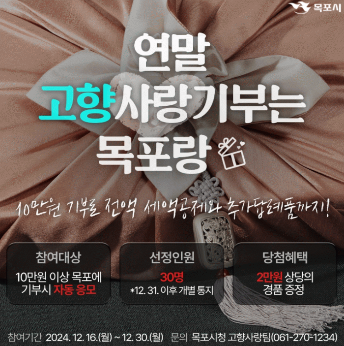 '2024년 연말 고향사랑기부는 목포랑'이벤트는 16일부터 12월 30일까지 진행되며, 해당 기간 중 목포시에 10만원 이상 기부한 경우 별도의 신청 없이 자동으로 이벤트에 응모된다.
