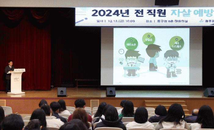 나기회 조선대학교 원스톱 학생 상담 센터 연구교수가 강사로 나서 ▲직장인의 자살 문제와 현황 ▲자살 위험 요인과 자살 신호 ▲도움 방법 등에 대해 설명했다.