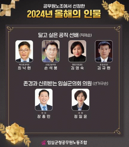 임공노는 지난 12월 9일부터 11일까지 3일간 임실군청 공무원 701명을 대상으로 설문조사를 실시했고,‘닮고 싶은 공직 선배’와‘존경과 신뢰받는 임실군의회 의원’두 분야에서 각각 인물과 선택한 이유를 조사했다.