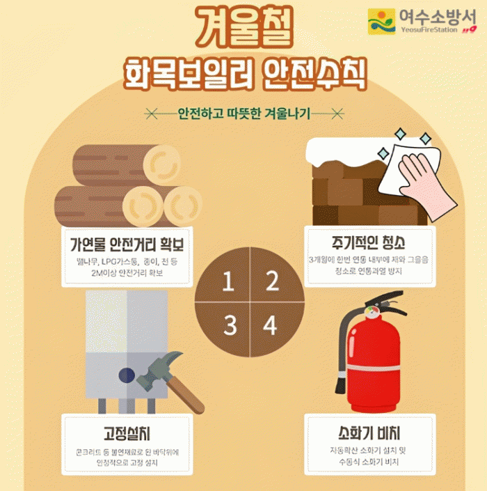 이에 따라 남양주소방서는 ‘가연물 안전거리 확보’, ‘주기적인 청소’, ‘보일러 고정설치’, ‘소화기 비치’ 등 4대 안전수칙을 실천할 것을 권장하고 있다.