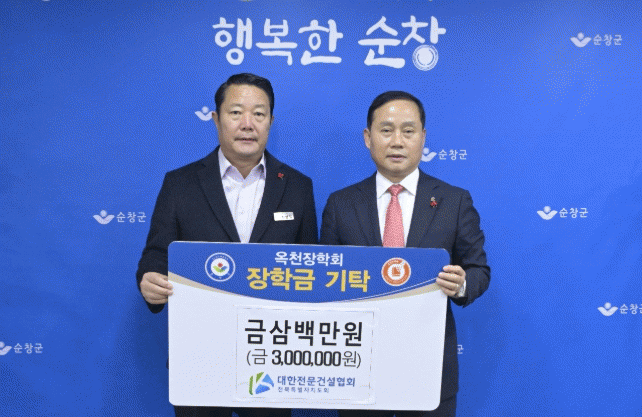 순창군은 대한전문건설협회 전북특별자치도회(회장 임근홍)가 옥천장학회에 지역인재 육성에 써달라며 장학금 300만원을 기탁했다고 16일 밝혔다.