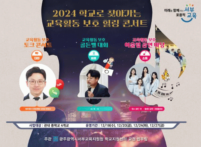 이번 콘서트는 ‘안전하고 행복한 학교 문화 조성’을 주제로 토크 콘서트, 교육활동 보호 골든벨 대회, 어울림 공연 마당 등이 진행될 예정이다.