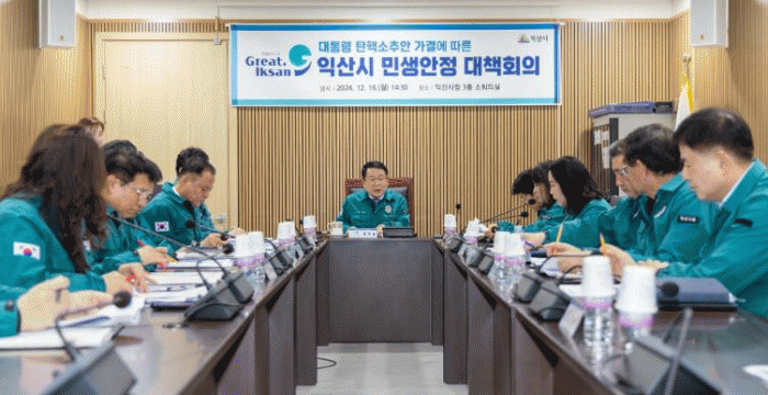 정헌율 익산시장은 16일 민생안정을 위한 긴급 회의를 열고 "연말연시 특수를 누릴 시기임에도 탄핵정국 여파로 골목 상권이 얼어붙어있다"면서 "대통령 탄핵 의결에 따른 혼란 상황에 대비하고 민생 안정을 위해 적극적으로 대책을 마련해야한다"고 강조했다.