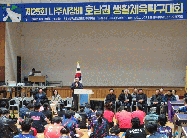 윤병태 나주시장은 “역사와 전통을 자랑하는 ‘제25회 호남권 생활체육 탁구대회’의 성공적 개최 축하한다”며, “앞으로도 지역경제 활성화 및 체육산업 육성을 위해 아낌없이 지원하겠다”고 밝혔다.