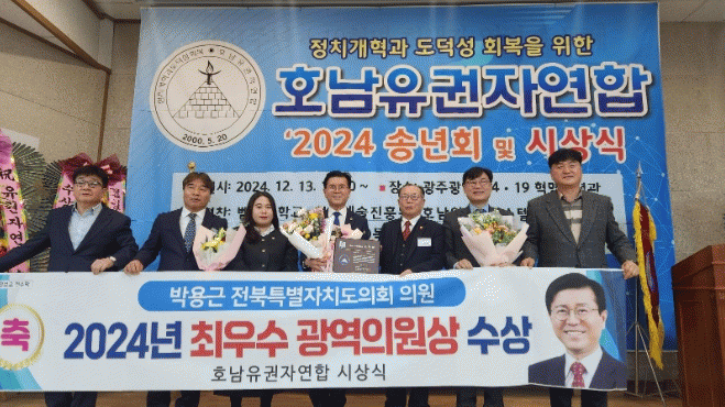 호남유권자연합은 박 의원이 그간 지역사회 발전과 건강한 지역공동체 구현에 앞장서 왔을 뿐만 아니라 2024년도 활발한 의정활동을 통해 수많은 빛나는 업적을 쌓아 전북특별자치도의회 최우수 의원으로 선정됐다고 밝혔다.