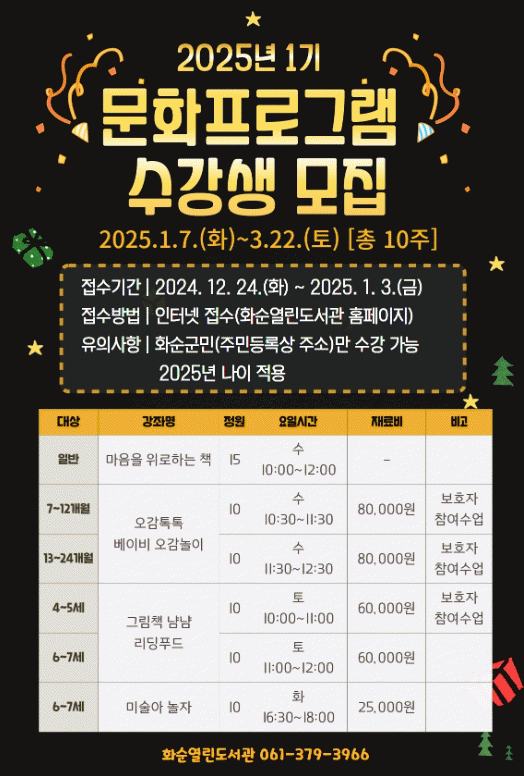 신청 기간은 12월 24일부터 2025년 1월 3일까지 화순열린도서관 홈페이지를 통해 선착순으로 신청할 수 있으며, 수강료는 무료지만 재료비와 교재비는 수강생이 부담해야 한다.