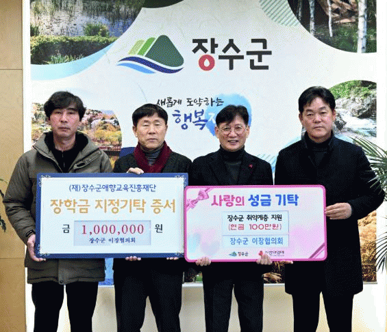 장수군 이장협의회는 17일 군청에 방문해 지역 교육 발전을 위한 장학금과 어려운 이웃을 위한 성금을 각 100만원씩 총 200만원을 기탁했다.