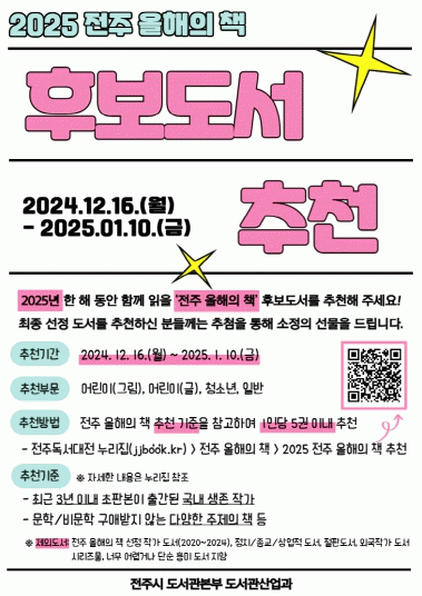 전주시는 1년 동안 시민들과 함께 읽을 ‘2025 전주 올해의 책’ 후보도서를 오는 1월 10일까지 추천받는다고 17일 밝혔다.