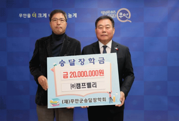 ㈜캠프밸리는 몽탄면에 본사를 두고 있는 등산 및 캠핑용품 생산 전문업체로써 지난 2019년부터 꾸준히 승달장학금을 기탁해 누적액이 1억에 달하는 등 지역인재 양성에 앞장서고 있다.