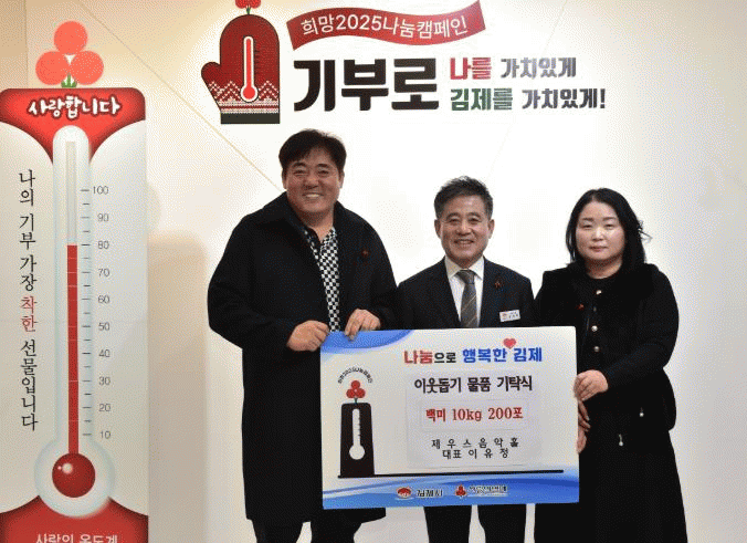 정성주 김제시장은 “어려운 경제 상황에도 소중한 백미를 기부해 주신 제우스음악홀에 감사드리며, 기부해 주신 백미는 관내 저소득 가정에 잘 전달하겠다.”고 전했다.