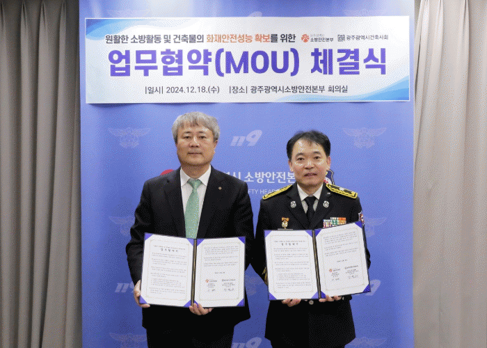 김문용 광주소방안전본부장은 “광주건축사회와 협약을 통해 건축물의 화재안전 성능을 확보해 시민의 생명과 재산 보호에 최선을 다하겠다”고 말했다.