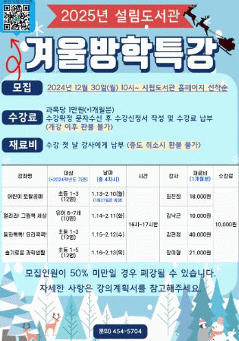 겨울 프로그램 관련 문의사항은 설림도서관으로 문의하면 된다.