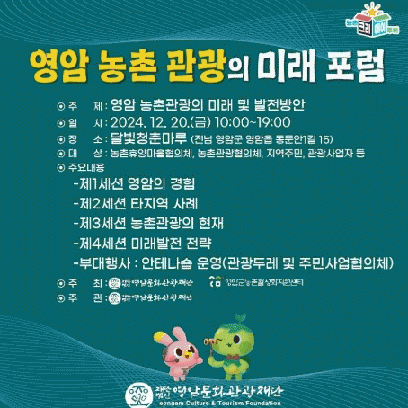(재)영암문화관광재단 조형빈 PD는 “이번 포럼을 통해 지역의 다양한 참여인력들이 연대하고 영암 농촌관광에 대한 아이디어를 발굴하여 2025년 새로운 사업을 모색할 수 있기를 기대한다.”고 밝혔다.