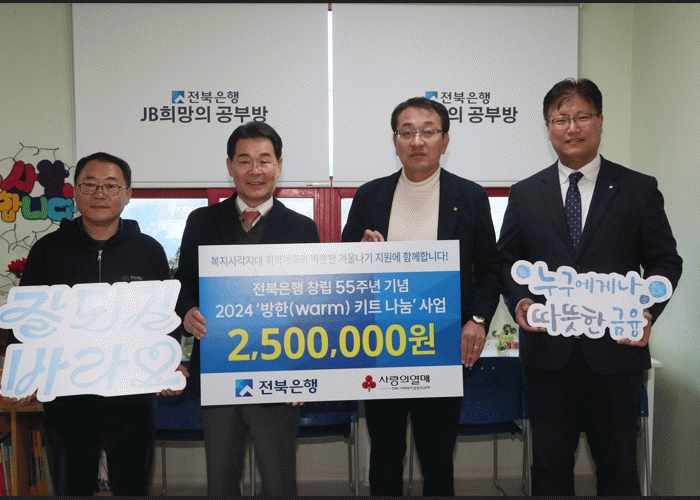 전북은행은 지속되는 경기침체 상황에서 겨울철 난방에 어려움을 겪는 저소득 취약계층들이 갑자기 찾아온 추위를 따뜻하게 보낼 수 있도록 2024‘방한(warm)키트 나눔’사업을 마련했으며, 기탁식에는 권익현 부안군수와 전상익 전북은행 부행장과 김선재 부안지점장이 참석했다.