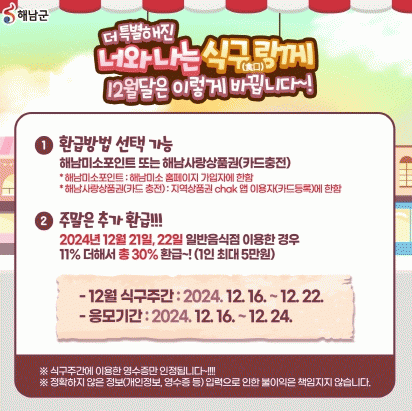 군 관계자는“식구랑께 이벤트로 소비를 유도해 지역 음식점 홍보뿐만 아니라 지역경제 활성화에도 큰 도움이 될 것으로 기대한다”며“식구주간 해남을 찾는 모든 분들이 식구의 의미를 되새기며 즐거운 시간 가지시길 바란다”고 전했다.