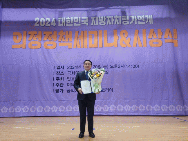 이번 시상은 여의도정책연구원이 지방자치 활성화와 주민 행복 정책 발굴에 기여한 우수의원을 선정하여 수여하는 권위 있는 상으로 주민 만족도 조사, 지방자치제도 활성화, 지역발전 시책 등 다양한 평가 기준을 기반으로 공익기구인 모니터링코리아와 함께 엄격한 심사를 통해 수상자가 결정됐다.