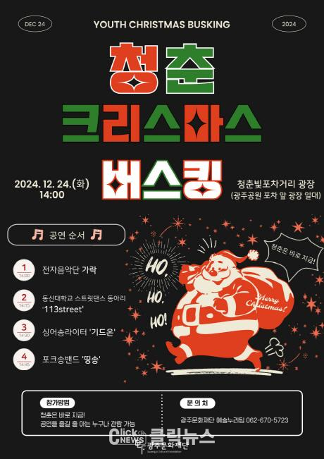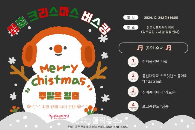 이번 행사는 광주시의 대자보(대중교통‧자전거‧보행)도시 실증사업 1호로 조성된 ‘광주공원 청춘빛포차거리 광장’을 청년들이 시민들의 힐링을 위한 문화광장으로 만들어가는 첫 단추다. 연말과 크리스마스를 맞아 캐럴과 추억의 7080명곡, 트로트 등 다양한 노래와 신나는 댄스 무대도 준비되어 있어 눈길을 끈다.
