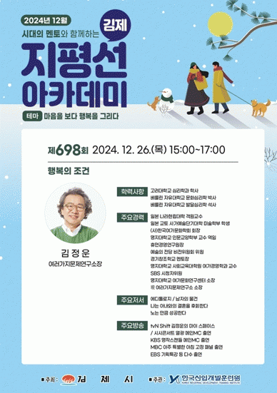 한편, 지평선아카데미는 시민 누구나 무료로 별도 신청 없이 선착순으로 참석 가능하며, 현장 참여가 어려운 시민을 위해 강연 영상이 김제시 홈페이지와 사이버학습센터에 업로드된다.