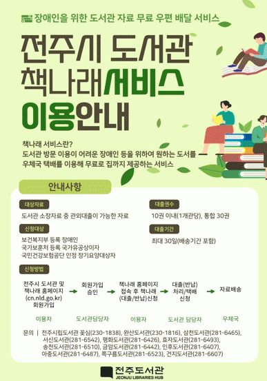 서비스 이용을 원하는 시민은 전주시립도서관 누리집(lib.jeonju.go.kr)과 책나래 누리집(cn.nl.go.kr)에 각각 회원으로 가입한 뒤 책나래 누리집을 통해 희망하는 도서관 자료를 대출·반납 신청하면 된다. 기타 증빙서류 및 회원가입 절차는 해당 도서관에 문의하면 자세히 안내받을 수 있다.