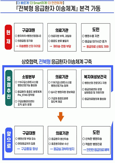 ‘전북형 응급환자 이송체계’는 기존 119구급대가 각 병원에 전화로 수용 여부를 문의했던 것과 달리, 119구급스마트시스템을 기반으로 현장 구급대원이 표준화된 환자 정보를 단말기 통해 다수의 의료기관에 동시에 제공하면 의료기관에서는 실시간 수용가능 여부를 응답하여 환자 상태에 맞는 최적의 병원을 신속히 선정·이송하는 것을 골자로 한다