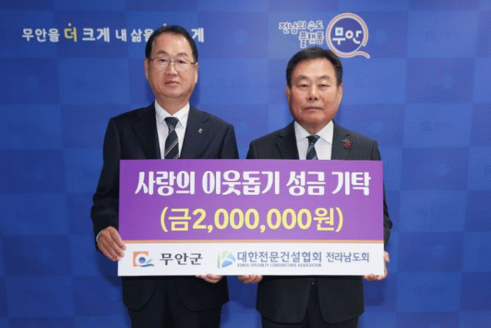 대한전문건설협회 전라남도회는 건설업의 육성 발전을 위해 설립된 협회로 전남에서 4천여명의 전문건설업자를 회원으로 두고 있으며, 매년 어려운 이웃을 위한 나눔 행보를 펼쳐오고 있다. 무안군에는 2022년에도 300만원을 기탁했었다.