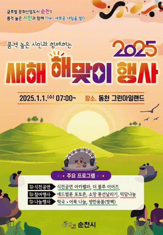 시 관계자는 “동천 그린아일랜드는 순천의 대표적인 해맞이 장소로 각광받고 있다”며 “많은 시민들이 함께 모여 새해를 맞이하고 소망을 나누는 좋은 시간이 되길 바란다”고 말했다.