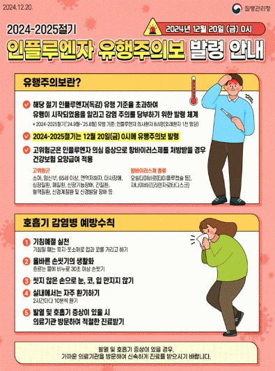 질병관리청 독감 표본감시 결과에 의하면, 최근 독감 의사환자가 1천 명당 13.6명으로 유행기준인 8.6명을 넘어 전 연령층에서 지속 증가하고 있다.