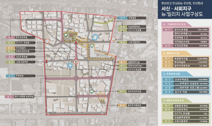 주요사업 내용으로는 ▲맹지 해소와 시설 접근성 개선을 위한 도로개설 ▲복합편의시설, 무더위쉼터, 쌈지주차장 등 생활편의시설 공급 ▲CCTV, 안심벨, 쓰레기 처리장 등 생활안심 스마트 환경 조성 등이 포함될 예정이다.