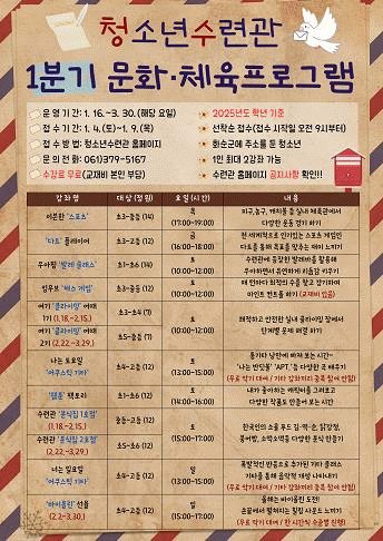 지원 대상은 화순군에 주소를 둔 청소년이며, 신청 방법은 1월4일부터 9일까지 화순군청소년수련관누리집 프로그램 신청 게시판에서 하면 된다.