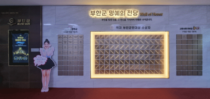 특히 명예의 전당 내 설치된 무인정보단말기(키오스크)를 통해 동판에 자세히 기재되지 못한 수상자 및 기부자들의 공적 내용을 개별 화면을 통해 확인할 수 있어 그들의 헌신과 기여를 군민들과 더욱 깊이 나눌 수 있는 기회를 제공한다.
