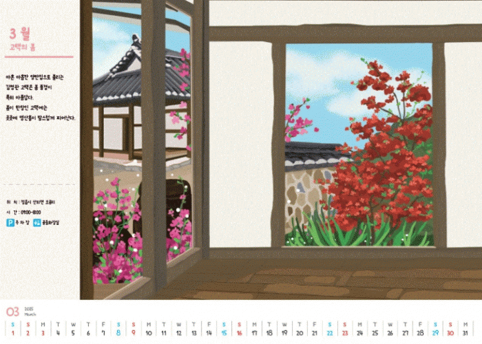 달력에는 매달 정읍의 계절별 명소를 일러스트로 담아 사계절 내내 즐길 수 있는 정읍의 관광지를 소개하고 있다.