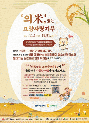 ‘의米(미)있는 고향사랑기부’ 캠페인은 전북특별자치도가 전북농협 및 14개 시군과 함께 11월부터 추진해 온 캠페인으로 고향사랑기부제와 쌀 소비 촉진을 연계한 운동이다.