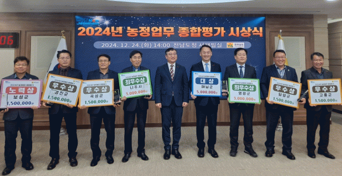 또 ▲축산정책 분야 대상은 영광군, 최우수상 나주시·담양군, 우수상 보성군·화순군, 장려상 고흥군·순천시 ▲동물방역 분야 대상에 나주시, 최우수상 함평군·강진군, 우수상은 영암군·진도군·구례군·영광군이 받았다.