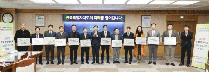 2024년 전북특별자치도 유망중소기업 선정 기업은 ▲(주)국도특장(대표 김재영) ▲나무숨(주)(대표 조동술) ▲(유)동방이노베이션(대표 김준식) ▲(주)미소능력개발센터(대표 강현신) ▲비티에스(유)(대표 유춘열) ▲(주)성현(대표 김호성) ▲(주)아이버스(대표 강주일, 강세영) ▲(주)아이오토(대표 김영석) ▲(주)엠에스이엔지(대표 서종윤) ▲장수도깨비동굴김치 영농조합법인(대표 고석열) ▲(주)피엘티(대표 최규영) ▲(유)한빛글로벌(대표 성지호, 이진희) 12개 기업이다.