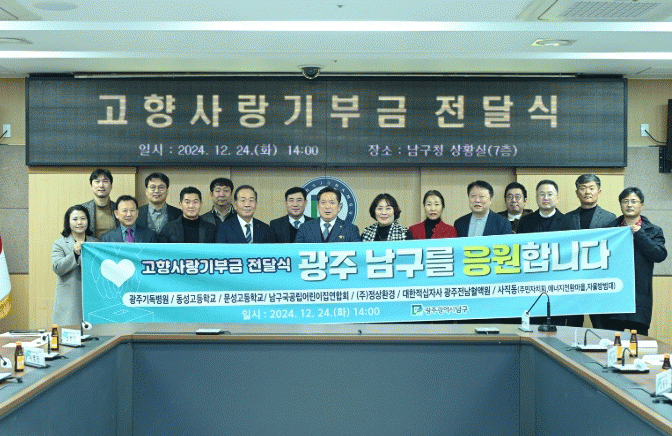 26일 남구에 따르면 2024년 연말 고향사랑 기부금 합동 기탁식이 지난 24일 구청 7층 상황실에서 열렸다.