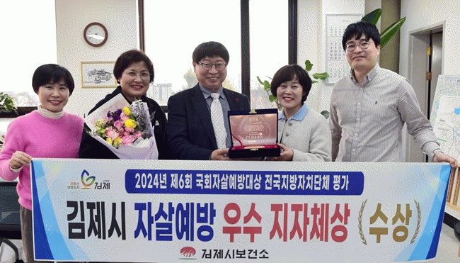 이로써 김제시는‘24년 정신건강사업에서 4개 분야의 우수지자체로 선정되는 성과를 거두었다. ▲행정안전부 선정, 자살분야 지역안전지수 우수지자체 ▲보건복지부 선정, 김제시정신건강복지센터 우수기관 ▲보건복지부 선정, 전 국민 마음투자사업 우수지자체 ▲국회자살예방포럼, 국회자살예방대상 우수지자체 등이다.