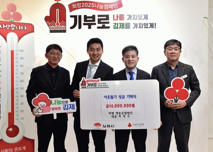 김제시는 26일 하랑영농조합법인이 연말이웃돕기 성금 1천만 원을 기탁했다고 밝혔다. 이번 기탁은 여름철에 이어진 나눔으로, 앞서 지난 7월에도 칵테일토마토 500박스를 기부하며 지역 주민들에게 신선한 농산물을 전달한 바 있다.