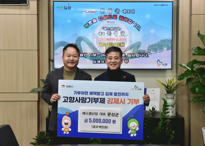 정성주 김제시장은 “어려운 경제 상황에서도 2년 연속 고향사랑기부로 김제시를 응원해주신 문성군 대표님의 따뜻한 마음에 진심으로 감사드린다.”며 “김제시 발전을 응원하는 기업인들의 소중한 마음을 잊지 않고 기부금이 의미 있는 일에 사용될 수 있도록 매년 사업을 발굴해 적극 추진하겠다.”고 말했다.