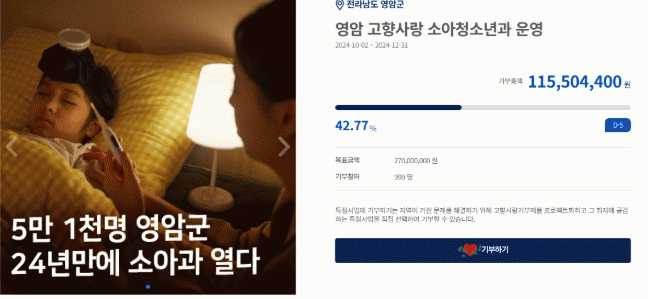 우승희 영암군수는 “전국에서 보내주신 고향사랑기부금이 영암군민 삶을 바꾸는 기적을 만들고 있다. 더 많은 분들이 영암에 고향사랑기부해 연말정산 혜택과 함께 풍성한 답례품 선물도 받아가길 바란다”라고 말했다.