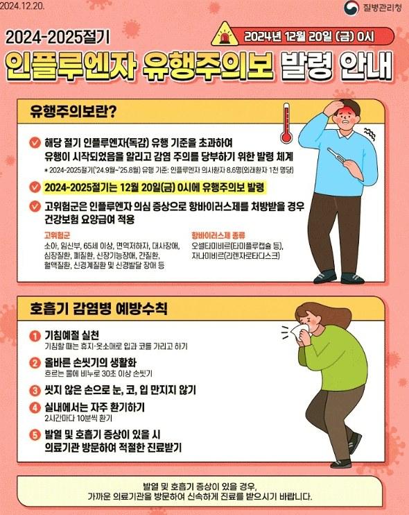 질병관리청은 인플루엔자 환자수 증가에 따라 지난 20일부터 전국에 인플루엔자(독감) 유행주의보를 발령했다.