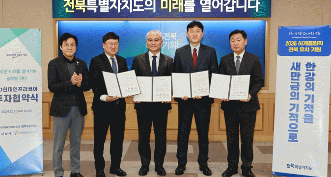 이를 위해 26일 전북특별자치도 회의실에서 김관영 도지사, 군산시 신원식 부시장, 한국산업단지공단 박종배 본부장, HD현대인프라코어 오승현 대표, 신영대 국회의원 등이 참석한 가운데 생산시설 증설을 위한 투자협약을 체결했다.