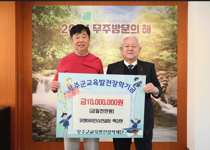 한편, ㈜유엔아이인슈컨설팅은 보험 대리 및 중개업체로 백 대표는 10여 년 전부터 무주에 정착해 수도권과 무주를 오가며 기업을 운영해 오고 있으며 지난 2020년부터 올해까지 무주군에 기탁한 장학금만 5천5백만 원에 달한다.