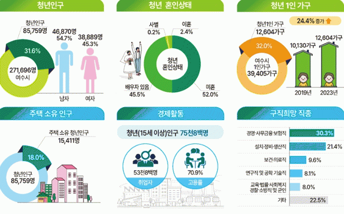 시는 지난 2023년 기준 여수시에 주소를 둔 18 부터 45세 청년을 대상으로 통계를 작성했으며, 항목은 인구·가구, 경제, 일자리, 창업, 복지, 건강 등 6개 부문 96개 항목으로 구성됐다.