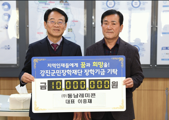강진원 강진군민장학재단 이사장은 “동남레미콘, 강진군 게이트볼협회, LC마트, 전남문화관광해설사협회가 한마음, 한뜻으로 지역 학생들을 위해 장학금 기탁을 해 진심으로 감사드린다”며 “도움이 필요한 학생들에게 소중하게 잘 사용하겠다”고 강조했다.