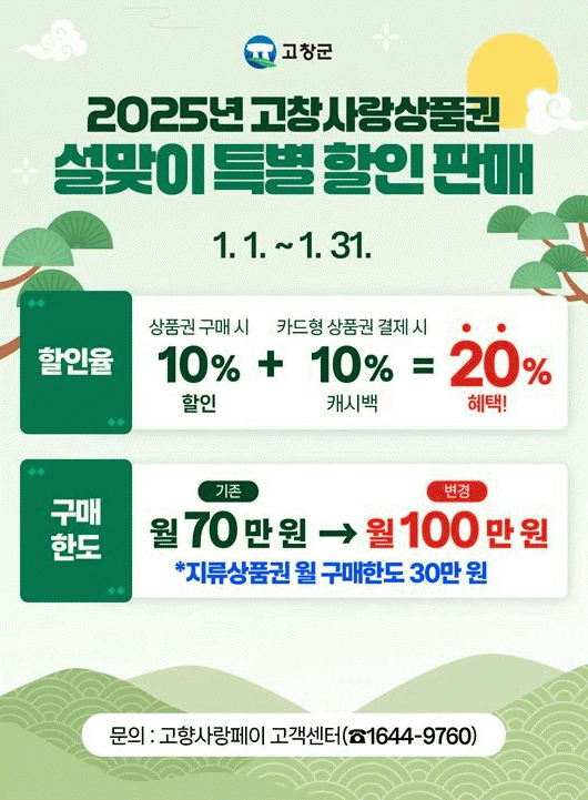 또한 지출 수요가 많은 설 명절을 앞두고 구매한도를 기존 70만원에서 100만원까지 상향하여 군민들의 부담을 덜고 지역 상권에 활력을 불어넣는다.