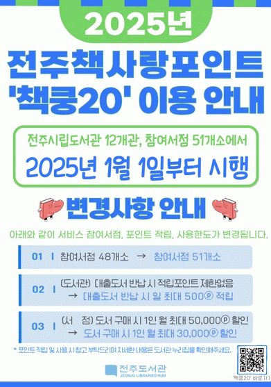 최현창 전주시 도서관본부장은 “2024년에는 한강 작가의 노벨문학상 수상 파급효과로 시민의 도서 구입이 증가하면서 서비스가 조기 종료될 정도로 독서 열기가 뜨거웠다”면서 “2025년 새해에도 전주시민이 독서 활동을 꾸준히 이어갈 수 있도록 ‘책쿵20’서비스를 지속 운영하겠다”고 말했다.