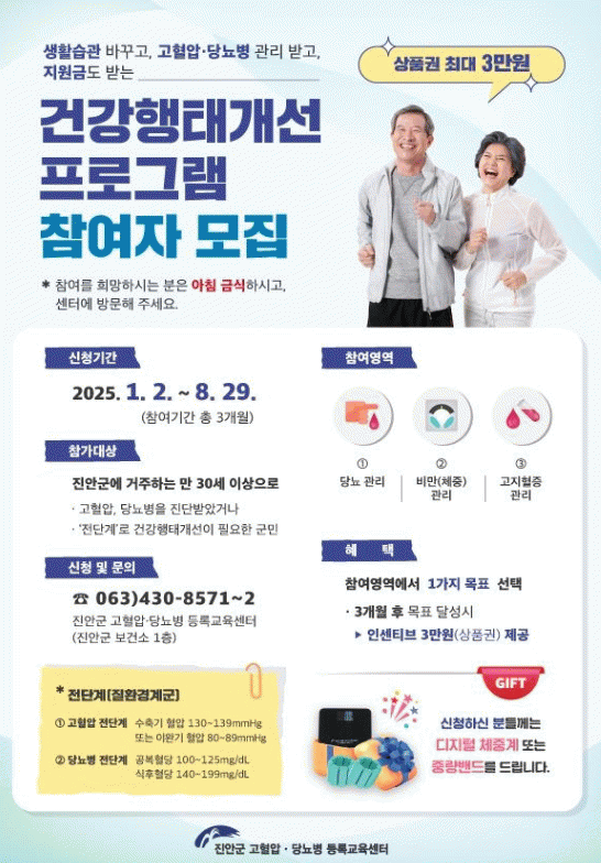 자세한 사항은 진안군 고혈압·당뇨병 등록·교육센터 (063-430-8571~2)로 문의하면 된다.