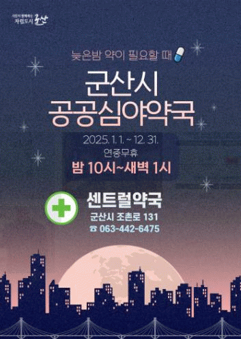 공공심야약국은 오후 10시부터 다음날 새벽 1시까지 365일(연중무휴) 운영되는 약국이다.