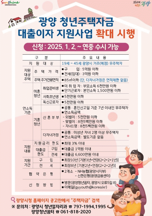 ‘광양 청년주택자금 대출이자 지원사업’과 관련한 자세한 사항이나 관련 서류는 광양시 누리집(홈페이지) 공고란에서 확인할 수 있으며, 궁금한 점은 청년일자리과 또는 광양청년꿈터 문의하면 된다.